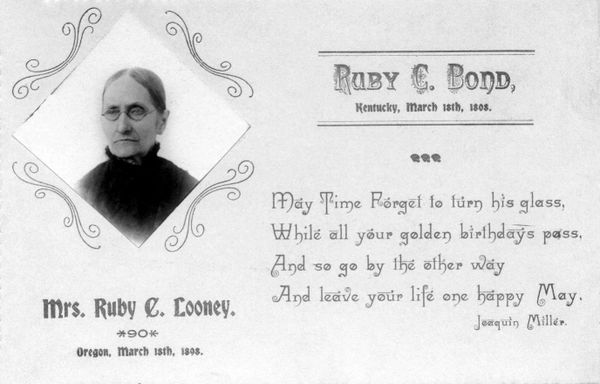 She was born in Kentucky March 18,1808. Ruby Bond married Jesse Walton Looney on March 16,1827. Together they had 13 children.